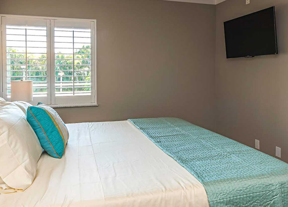 Ideal for business travellers, the newly-renovated One-Bedroom Executive Suites have more than 600 square-feet of space with modern décor and furnishings. The living room has a pull-out sofa (ideal for children), a 50” flatscreen TV and easy access to the screened lanai. The full kitchen has an oven/stove, sink, full fridge, microwave, dishwasher, cookware, dish ware, utensils, glassware, toaster and coffeemaker. The separate bedroom features a comfortable King bed.