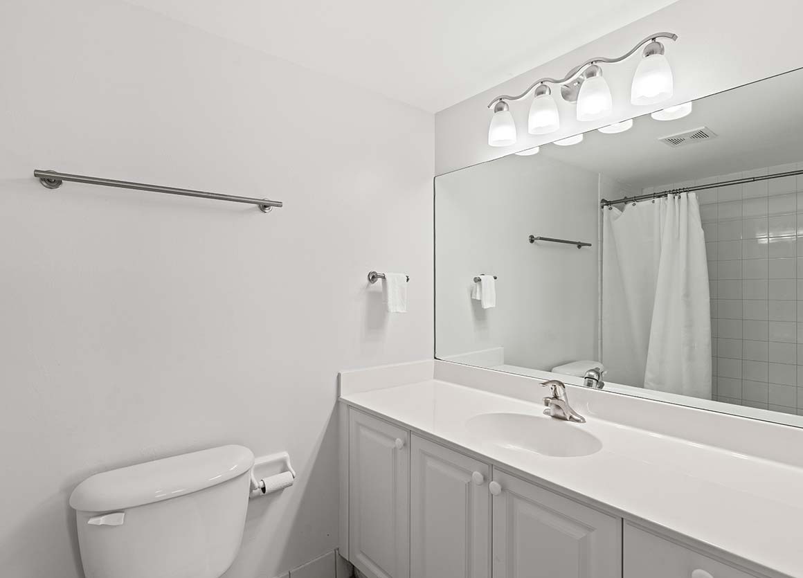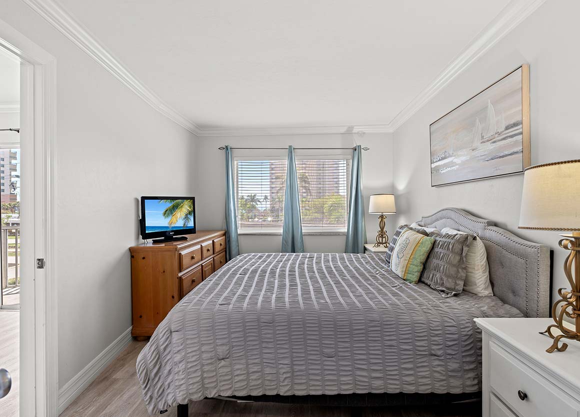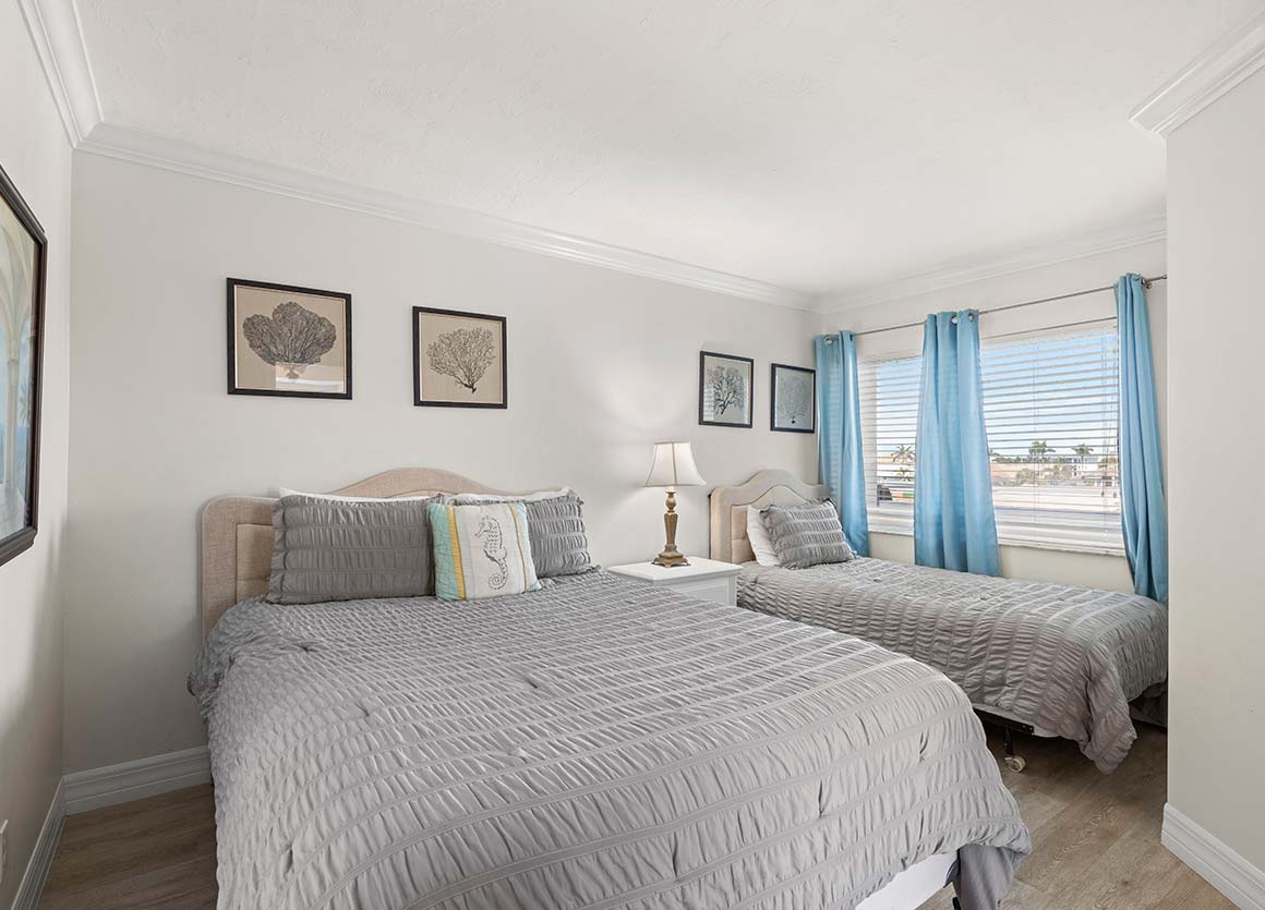 Ideal for shared accommodations among family and friends, the large two-bedroom suite features more than 1,000 square feet of space to spread out in. The large living area has a pull-out sofa (ideal for children), a 42” flatscreen TV, attractive furnishings and easy access to the screened lanai. The kitchen features an oven/stove, sink, full fridge, microwave, dishwasher, cookware, dishware, utensils, glassware, toaster and coffeemaker. The master bedroom features a Queen bed and a 32” flatscreen TV. The second bedroom features two Twin beds and a 32” flatscreen TV. This suite sleeps a maximum of six people.
